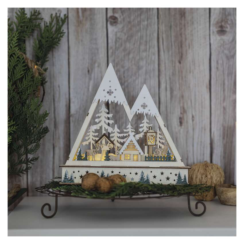 dekoráciou LED. Vyrezávaná dekorácia s motívom zasnežených hôr a