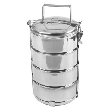 4-dielny nerezový obedár s praktickým držiakom a uzatváracími viečkami.
