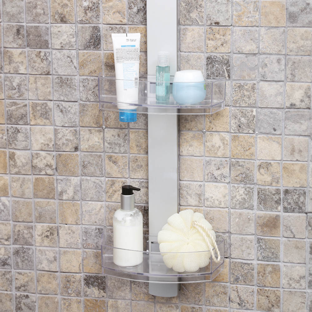 Kúpeľňová polica na zavesenie nad sprchovací kút. Polica má prísavku, ktorá pomáha udržať policu na mieste.